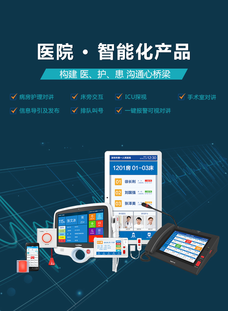 涵蓋醫院弱電智能化建設14個子系統方案,分“智慧病房”、“智慧門診”兩部分,包括護理信息對講、床旁交互、ICU探視、門診排隊等系統。